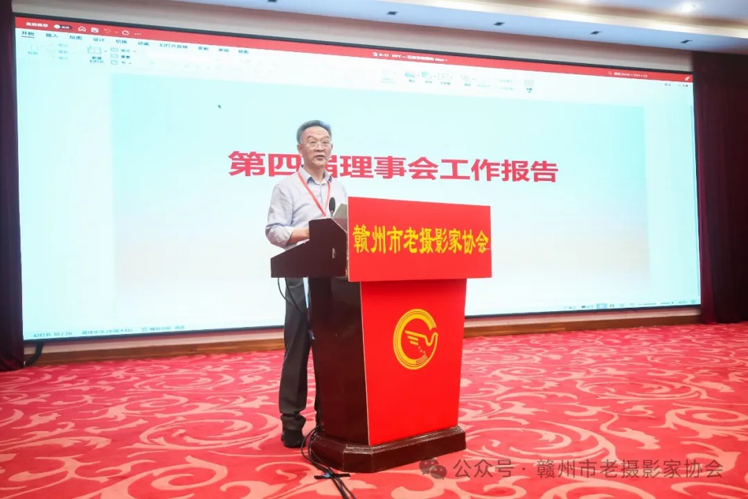 第四届理事会主席庞军在会议上作了题为《紧跟时代步伐,加强协会建设,凝心聚力再创辉煌》的工作报告,报告全面总结了第四届理事会带领会员们做到五个坚持:坚持顾大局、坚持核心价值观、坚持创优创新、坚持服务大众和坚持以人为本,无论是在政治站位、技术创新、艺术探索还是在社会影响力等方面,作出了很大的贡献,希望大家今后要继续以担当精神承载历史使命,唱响主旋律,讴歌新时代,真实记录中国式现代化建设成就和亿万人民寻梦筑梦的奋斗历程,为宣传建设美丽赣州作出应有的贡献!