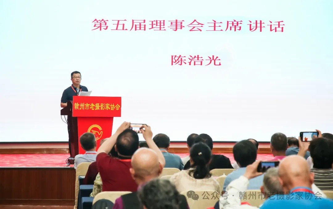 新当选的第五届理事会主席陈浩光在会议上表态讲话,号召全体会员要为人民立传,为时代立言,用镜头纪录祖国的繁荣昌盛,以影像留存社会的进步与发展,共同开创我市老年摄影事业的新气象、新成就,为建设美好赣州贡献出我们的一份力量。
